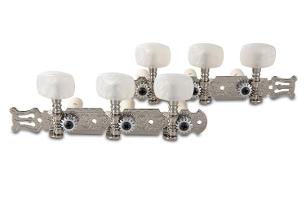 For slotted headstock, chrome plated with lyra Creme-colored perloid button, Nylon shafts diameter 9mm, shaft distance 35mm, plate size 123x17mm Gear ratio 14:1 Set 3 left/3 right in box