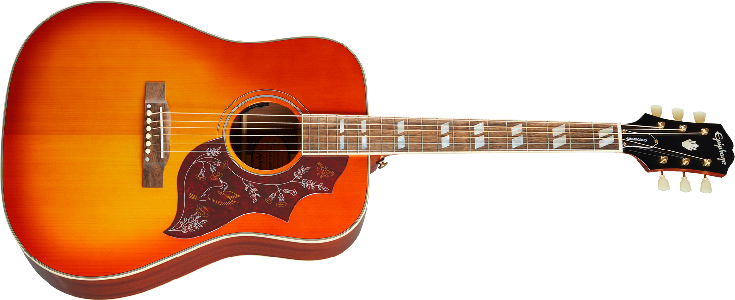 Epiphone's Most Faithful Hummingbird Takes Flight. The Hummingbird™ is one of the most instantly-recognizable and remarkable acoustic guitars ever built. The new Epiphone Inspired by Gibson™ Hummingbird blends solid woods, vintage appointments, and a Fishman® Sonicore under-saddle pickup and Sonitone preamp. Outfitted with gold Epiphone Deluxe tuners, top and back multi-ply binding, Kalamazoo style headstock, and a bone nut and saddle, it's available in Aged Antique Natural Gloss and Aged Heritage Cherry Sunburst Gloss finishes.