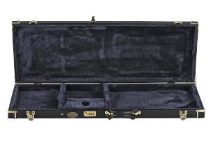 Wooden shell, sturdy, arched lid, stitched all round Gold plated locks, 1 combination lock 2 lid hinges 9 metal feet Side metal loops for carrying strap (strap not included) Comfortable soft handle Black, shagreened imitation leather cover Accessory compartment with lid, interior padding blue plush GEWA brass logo plate
