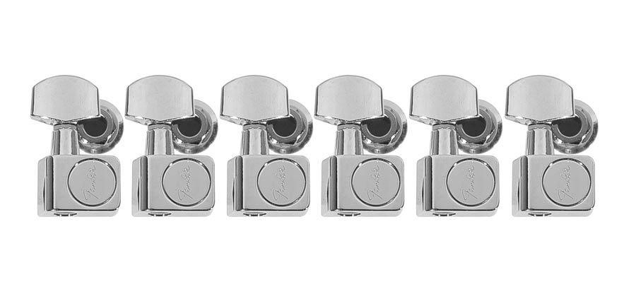 Set of six tuners designed to fit most modern-style Fender® electric guitars with dual-pin mounting configuration. Tall post tuners are used for low E and A strings and shorter post tuners used for D, G, B and high E strings. Staggered tuners increase the break angle over the nut and improve tuning stability. Available in chrome and gold plated. Mounting hardware included.