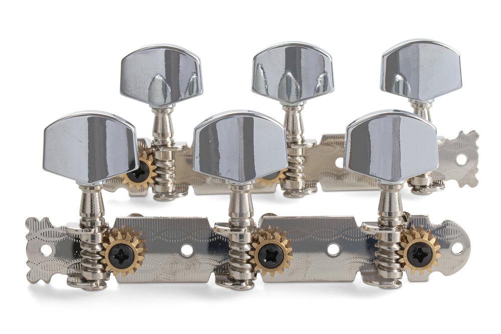 Machine head without lyraShaft distance 35 mm, diameter 6 mmGear ratio 14:1Nickel plated metal shafts for steel stringsDouble drilled to facilitate feeding in the stringsPrice per setNickel-plated metal buttons