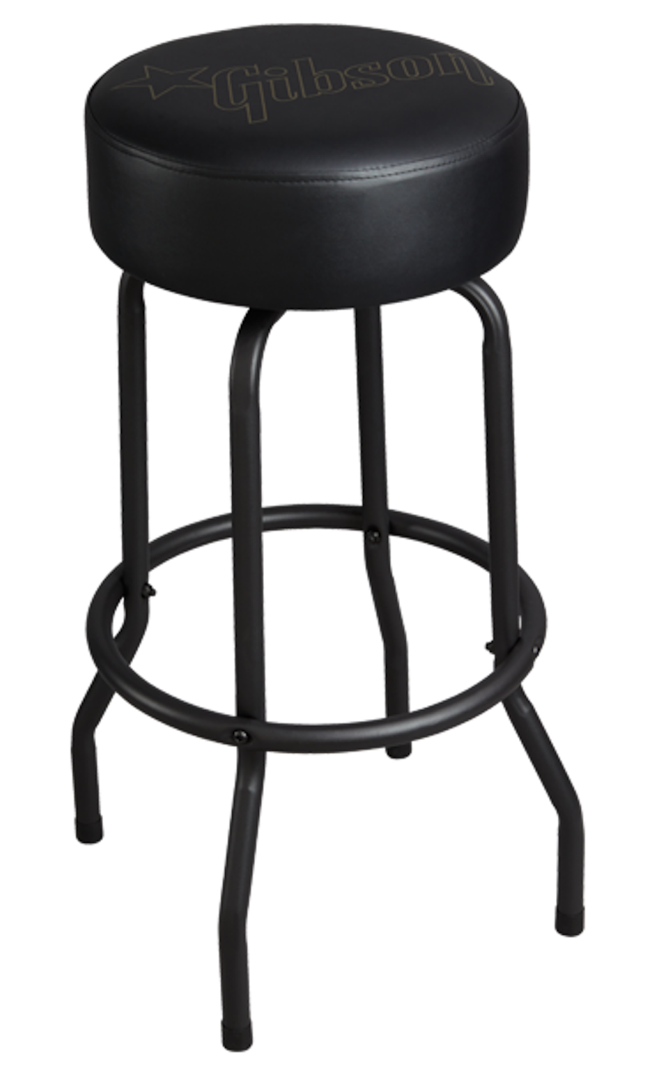 This 30" high playing stool features a comfortable, padded vinyl seat that swivels through 360 degrees and that is adorned with the Gibson Star logo. The classic barstool-style tubular steel legs have a matte black finish, and the stool has a foot ring for added comfort.